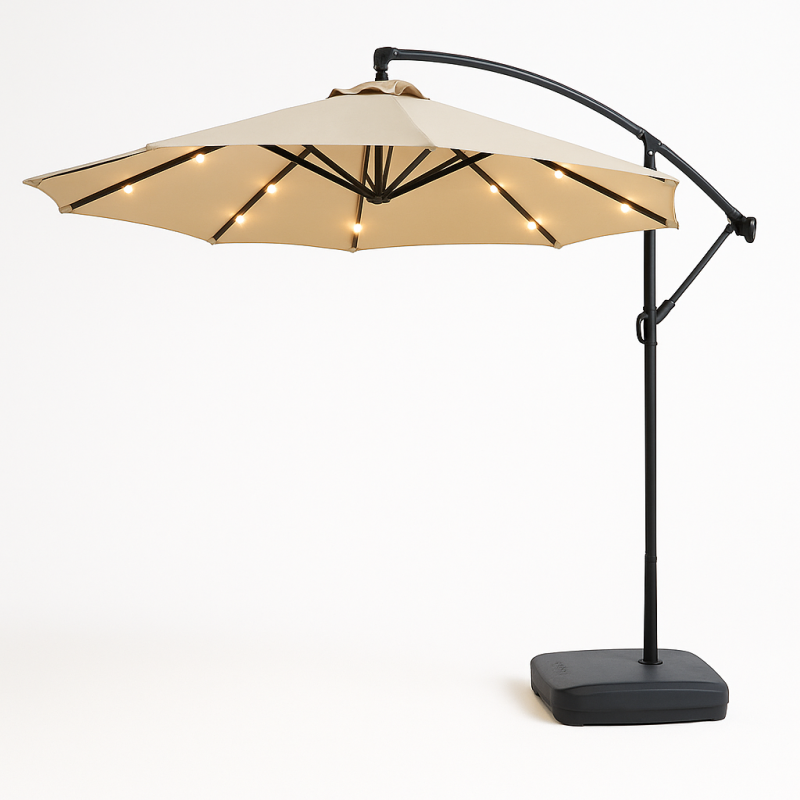 El Quitasol Lateral con Luces LED Beige de 3 metros es la combinación perfecta entre funcionalidad, diseño y ambientación. Su estructura de aluminio cantilever permite una sombra amplia sin ocupar espacio central, ideal para mesas, juegos de terraza o áreas de descanso.