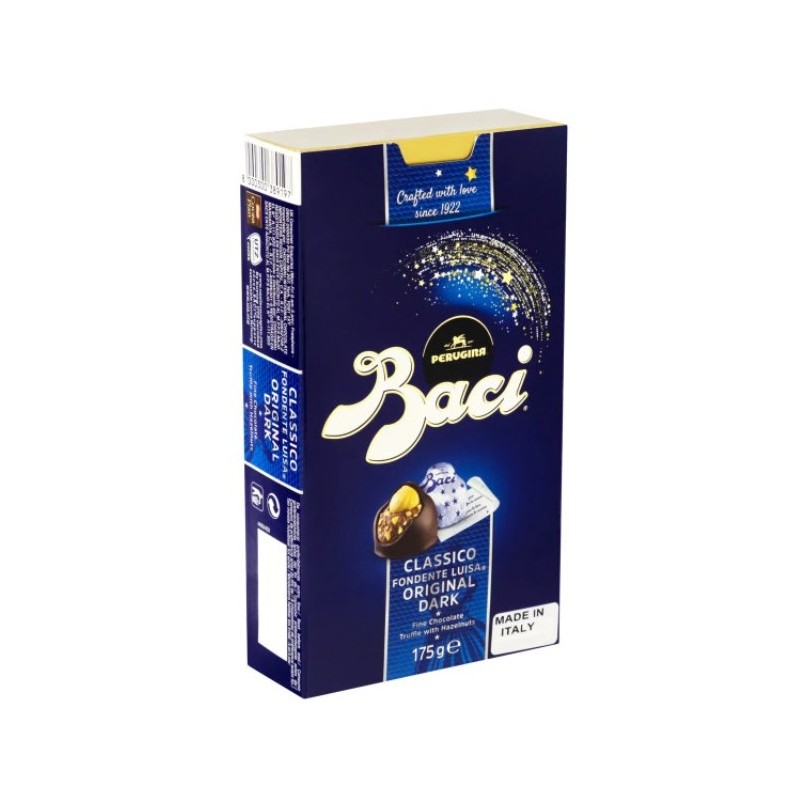 Los Baci Perugina Clásico Original Dark son el emblema del chocolate italiano. Cada bombón combina un corazón de avellanas enteras y crema de cacao, cubierto por una capa de exquisito chocolate amargo al 70%.