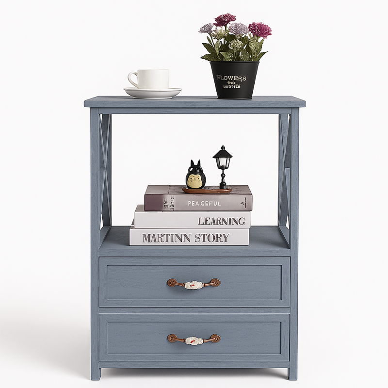 Dale un toque elegante y funcional a tu dormitorio o sala con el Velador Librero Tivoli Azul, un mueble versátil que combina estilo moderno, excelente capacidad de almacenamiento y materiales de alta calidad. Su diseño con laterales en “X” y color azul suave aporta personalidad sin perder sobriedad, adaptándose a ambientes nórdicos, clásicos o contemporáneos.