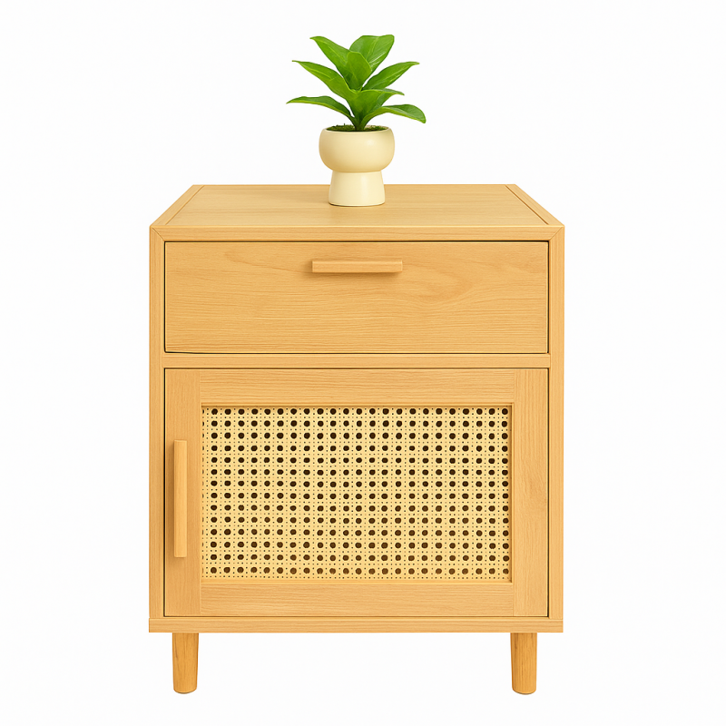 El Velador Oporto es la pieza perfecta para complementar tu dormitorio con estilo y funcionalidad. Su diseño moderno con toques nórdicos destaca por la combinación de madera clara y puerta con rejilla de ratán, aportando un aire fresco y natural al ambiente.