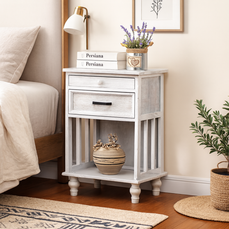 El Velador Vintage Provenza 2 Cajones Blanco combina un diseño clásico con un acabado elegante que aporta personalidad y calidez a cualquier dormitorio. Fabricado en madera maciza de tung, destaca por su resistencia, estabilidad y belleza natural, convirtiéndose en una pieza funcional y decorativa al mismo tiempo.