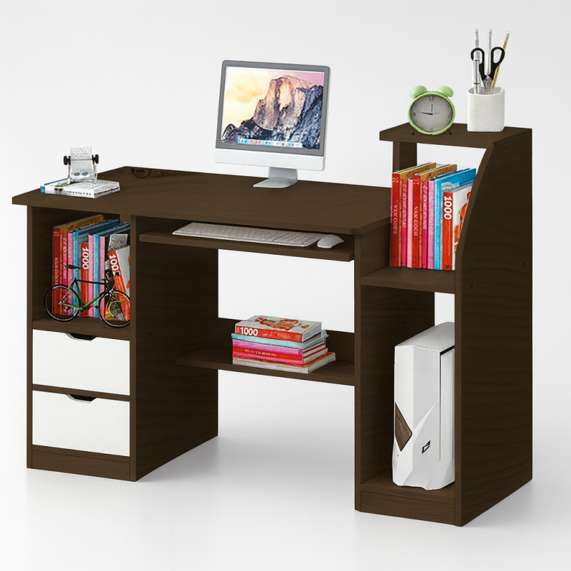Almacenaje inteligente: Cuenta con 2 gavetas y múltiples estantes para guardar papeles, accesorios y libros.