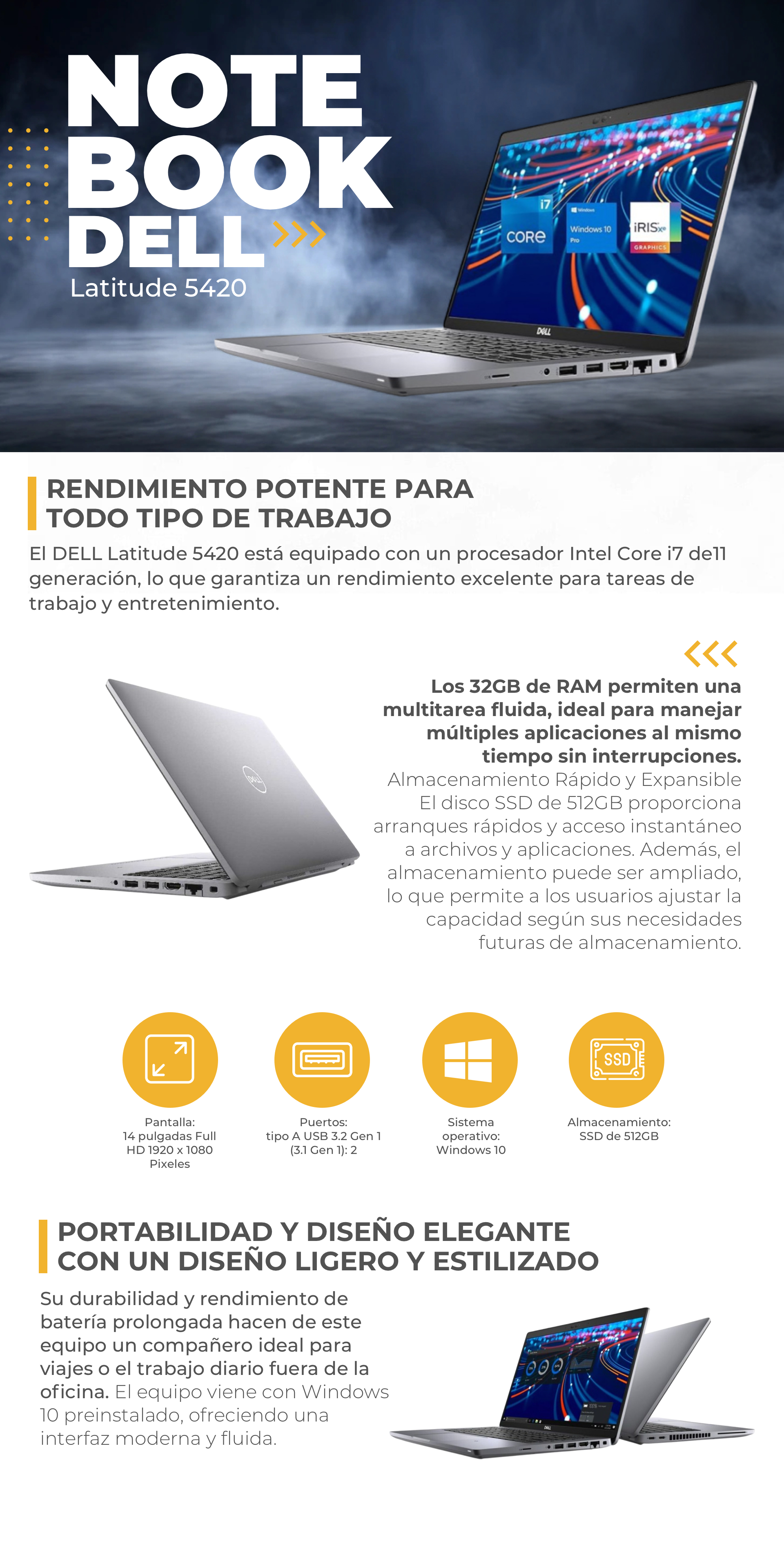 La Notebook Dell Latitude 5420 es una potente herramienta que combina un rendimiento excepcional con una construcción robusta y características avanzadas, haciéndola ideal para usuarios empresariales y profesionales que buscan una experiencia informática confiable y eficiente.